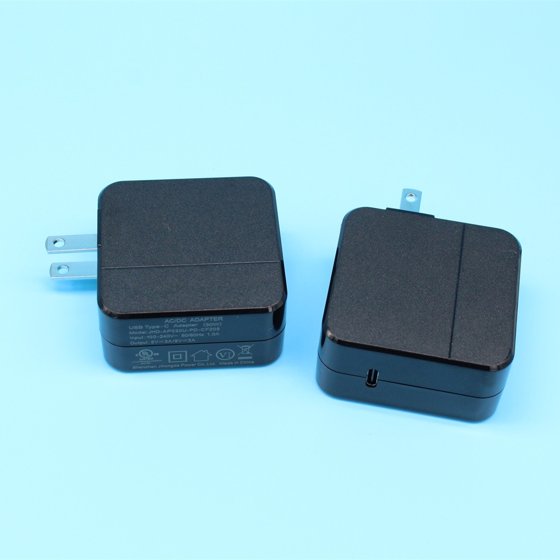 Model:JHD-AP030U-PD-CF205,Output:5V3A/9V3A,Safety Approval:UL,FCC,CB,CE,PSE,CCC.This USB C power adapter features the Type-C port with Power Delivery 3.0, providing an output of Max 30W--5V/3A, 9V/3A. It can fast charge for your PD compatible devices,High-speed charging for Apple phones, iPad, laptops, and most USB-C devices.